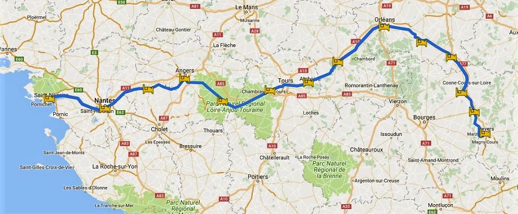 From Paris, you can take a train to Nevers (approx. 2h). On the end of your trip you can take a train from Saint-Nazaire.